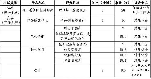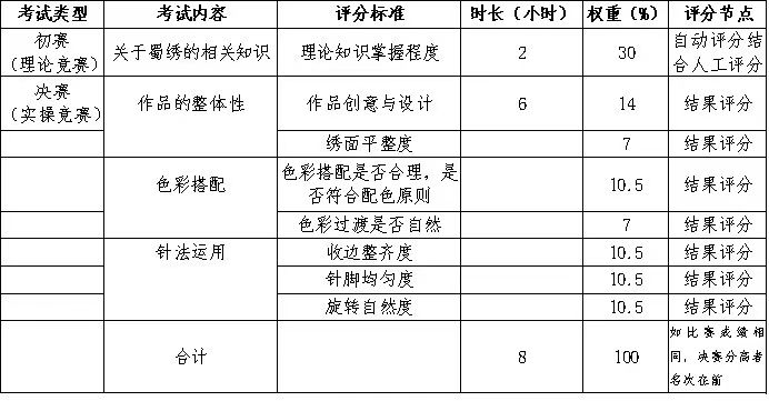 本赛项由初赛(理论竞赛)和决赛(实操竞赛)两个环节组成,初赛采用网考形式,决赛在四川音乐学院成都美术学院(川音资阳临空校区)举办。初赛考试成绩排名前50%选手进入决赛(当出现选手初赛成绩并列时,依次按以下规则排序:①多选题得分高者列前;②若仍相同,多选题加单选题得分高者列前;③若仍相同,多选题加单选题再加判断题得分高者列前;④若仍无法区分,则由裁判长召集评审组进行复核并形成书面裁定。),决赛总成绩中初赛理论考试成绩占30%,决赛实操成绩占70%(当出现选手总成绩并列时,依次按以下规则排序:①决赛成绩高者列前;②若仍相同,则比较“技法熟练度”单项得分;③若再相同,则比较“色彩搭配设计”单项得分;④若仍无法区分,则由裁判长召集评审组进行复核并形成书面裁定。)。初赛竞赛时间2小时,决赛竞赛时间6小时,总计考核时间8小时。具体竞赛内容见《四川省第二届新文艺行业技能竞赛工艺美术品设计师(蜀绣)项目技术工作文件》。