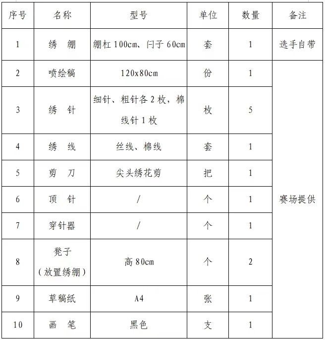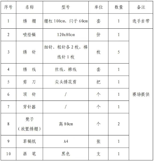 赛场配发的相关工具、材料,具体如表所示(绣绷按要求自带)。