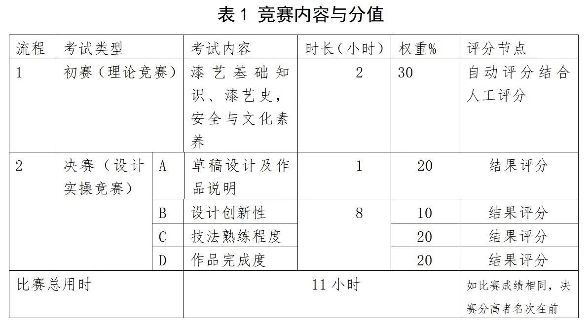 漆艺项目设计实操竞赛各组别竞赛内容、时长与分值详见表1: