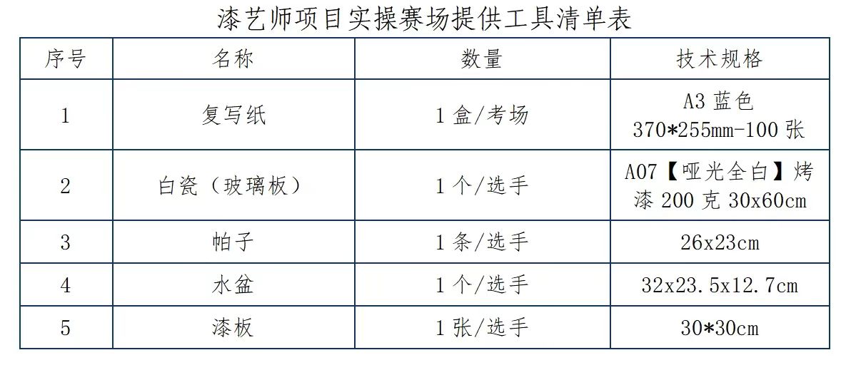 注:与本项目无关的工具、材料不得带入考场。相关工具赛前须经过现场工具检查小组检查、检录。另外,赛场配发的各类工具、材料,选手一律不得带出赛场。