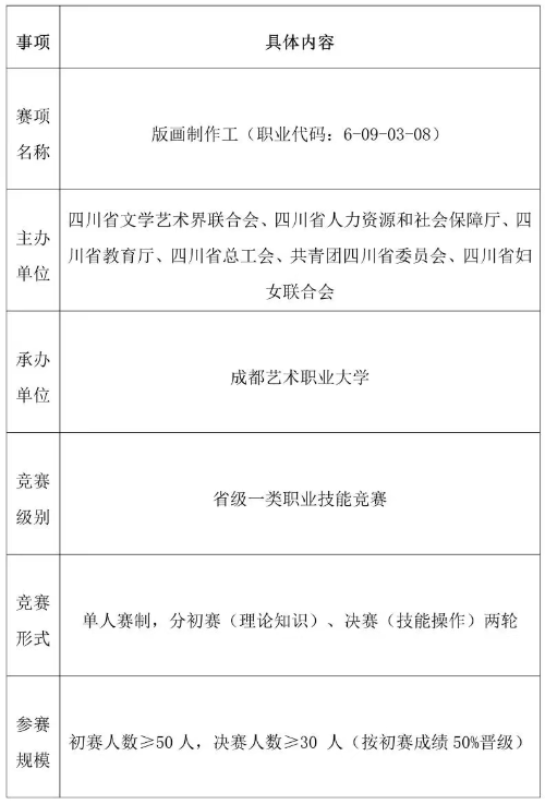 赛项名称:“四川技能大赛——四川省第二届新文艺行业技能大赛”工艺美术品制造人员(版画制作工)赛项。