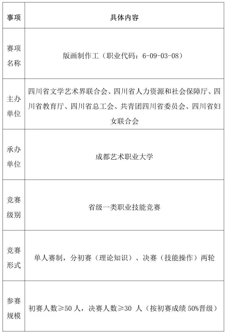 本次大赛由四川省文学艺术界联合会、四川省人力资源和社会保障厅、四川省教育厅、四川省总工会、共青团四川省委、四川省妇女联合会主办,四川省文联新文艺组织工作处、四川省职业技能鉴定指导中心、成都艺术职业大学承办、四川省沫若艺术院(四川省艺术院)协办,北京世纪超星信息技术发展有限责任公司技术支持,成都艺术职业大学艺术创作委员会、成都艺术职业大学相关学院及职能部门组织实施。现将工艺美术品制造人员(版画制作工)赛项有关事宜通知如下: