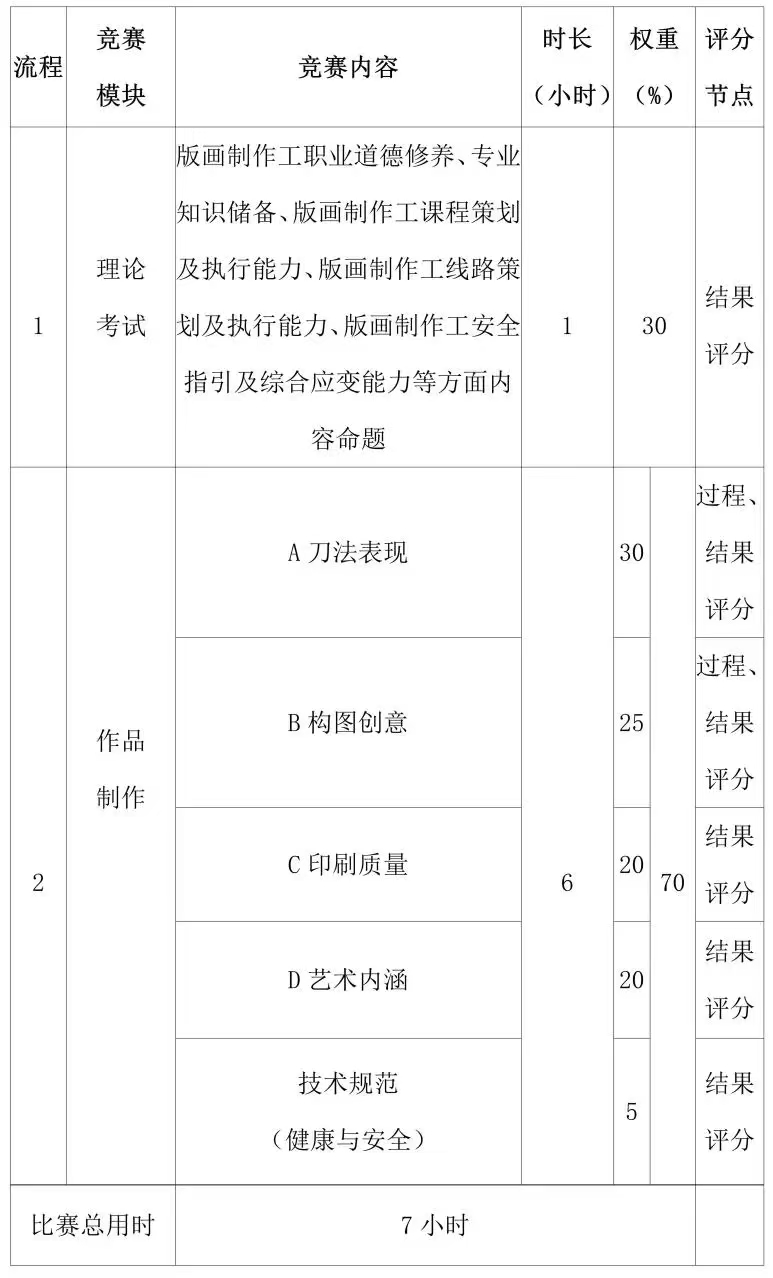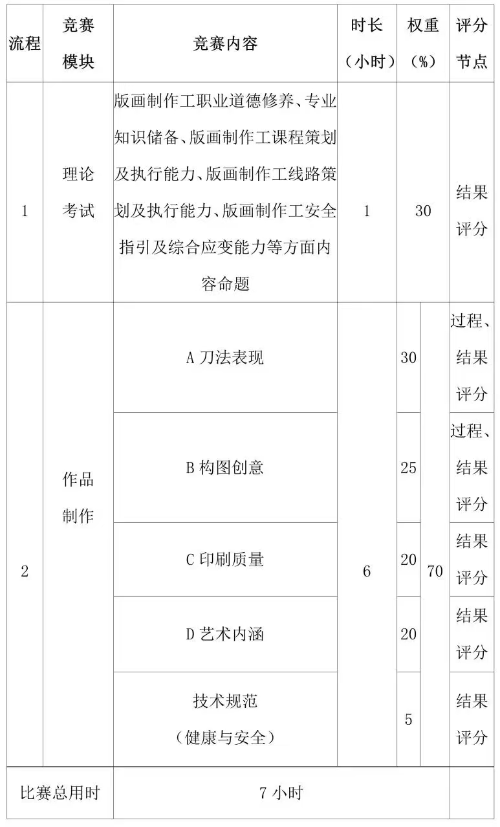 版画技术工项目设计实操竞赛各组别竞赛内容、时长与分值详见表:
