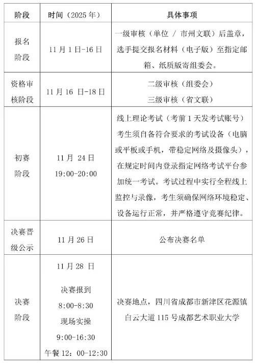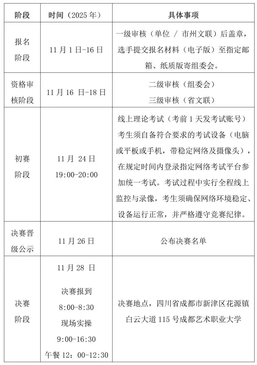 为深入贯彻党的二十大精神和习近平文化思想,落实习近平总书记关于“文艺两新”工作重要论述精神,根据《中共中央关于繁荣发展社会主义文艺的意见》,进一步落实省委十二届七次全会关于推进文化和旅游深度融合发展、做大做强文化旅游业的决定部署,加快推进大国工匠和高技能人才培养,突出文化引领带动作用,助力文化强省建设。根据四川省人力资源和社会保障厅《关于印发〈2025年四川省省级一类职业技能竞赛计划〉的通知》(川人社函〔2025〕513号)要求,经商人社、教育、工会、团委、妇联等有关部门,拟联合开展四川技能大赛—四川省第二届新文艺行业技能竞赛。