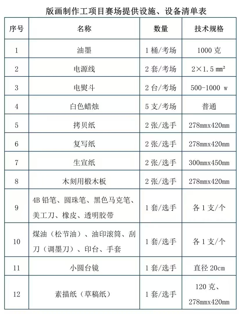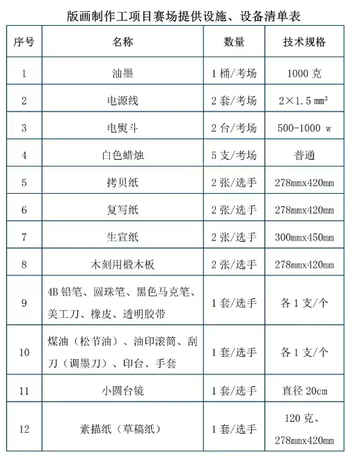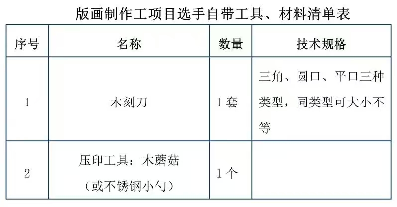 2.决赛赛场提供基础设备及耗材(椴木板、油墨、印刷工具、耗材等),选手需自带雕刻工具(三角刀、圆口刀、平口刀)及压印工具(木蘑菇或不锈钢小勺);