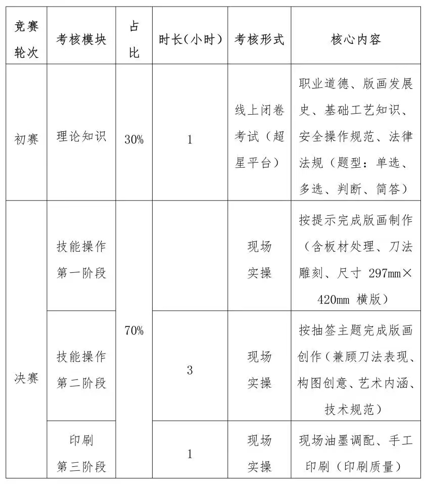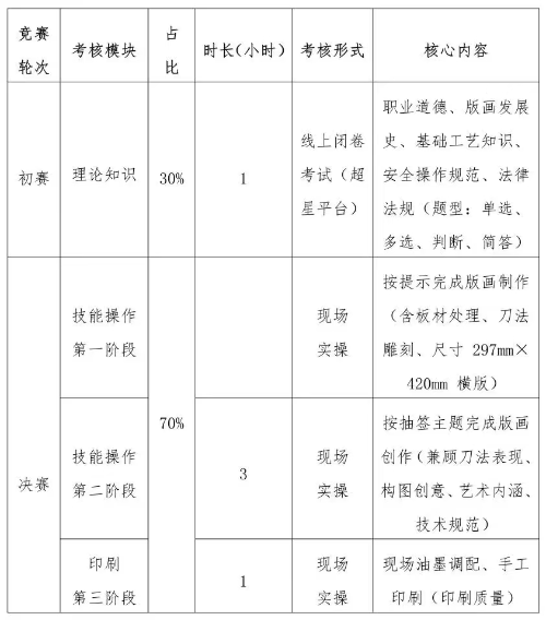本赛项由初赛(理论竞赛)和决赛(实操竞赛)两个环节组成,初赛采用网考形式,决赛在成都艺术职业大学(成都校区)举办。初赛考试成绩排名前50%选手进入决赛(当出现选手初赛成绩并列时,依次按以下规则排序:①多选题得分高者列前;②若仍相同,多选题加单选题得分高者列前;③若仍相同,多选题加单选题再加判断题得分高者列前;④若仍无法区分,则由裁判长召集评审组进行复核并形成书面裁定。),决赛总成绩中初赛理论考试成绩占30%,决赛实操成绩占70%(当出现选手总成绩并列时,依次按以下规则排序:①决赛成绩高者列前;②若仍相同,则比较“技法熟练度”单项得分;③若再相同,则比较“设计创新性”单项得分;④若仍无法区分,则由裁判长召集评审组进行复核并形成书面裁定。)。初赛竞赛时间2小时,决赛竞赛时间9小时,总计考核时间11小时。具体竞赛内容见《四川省第二届新文艺行业技能竞赛版画技术工师项目技术工作文件》。